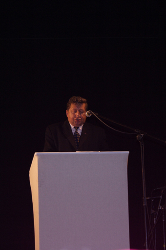 Przemówienie Burmistrza Polic Władysława Diakuna w sali kinowej.