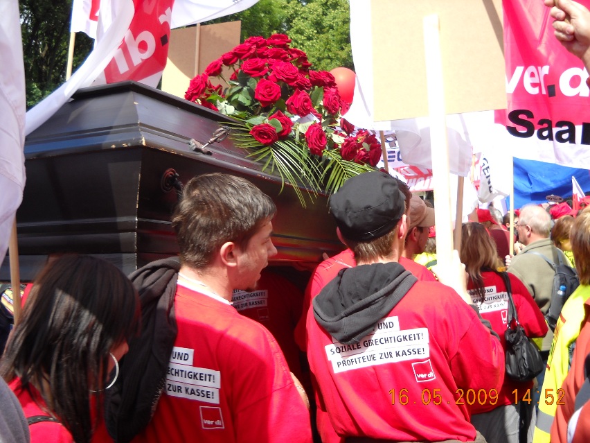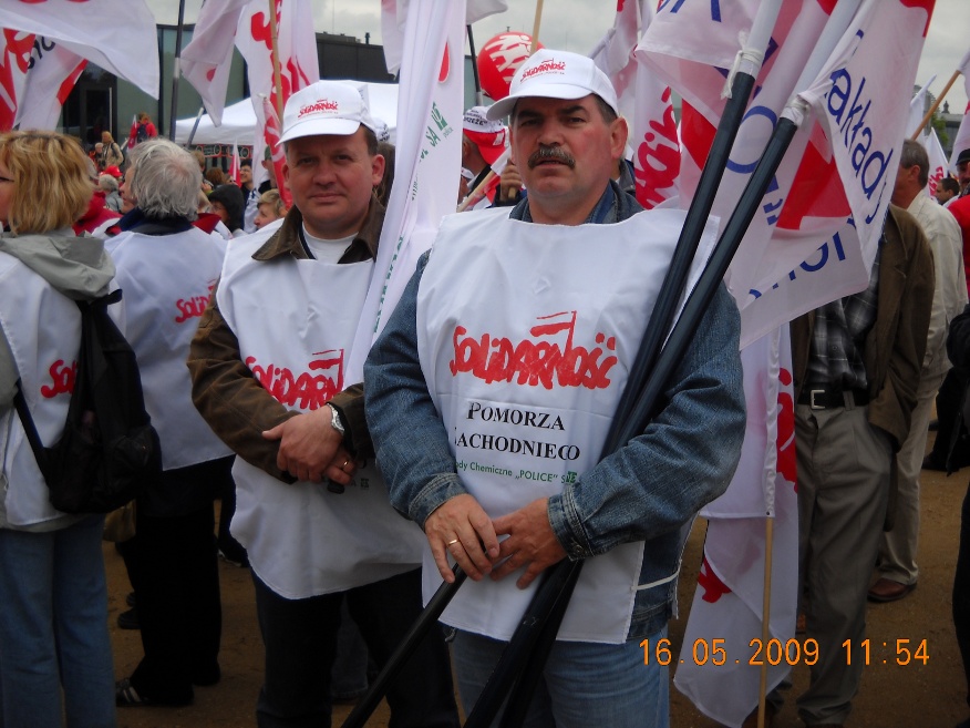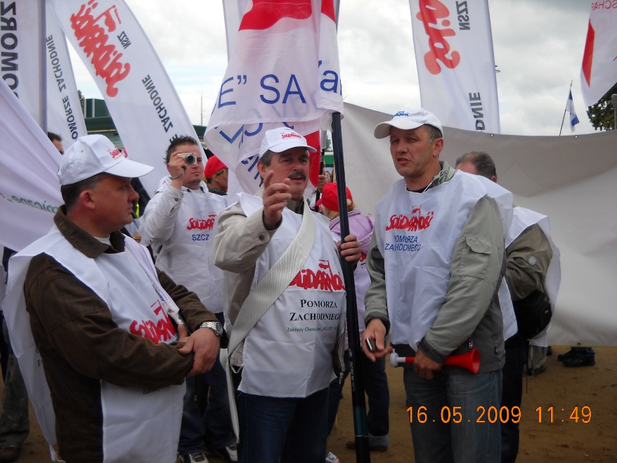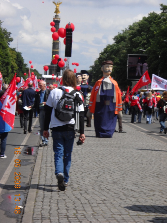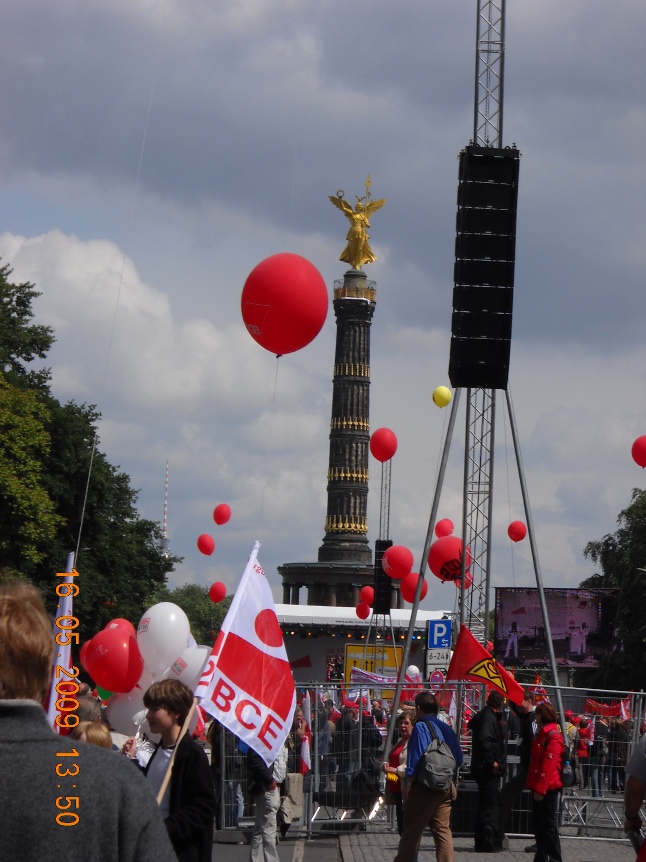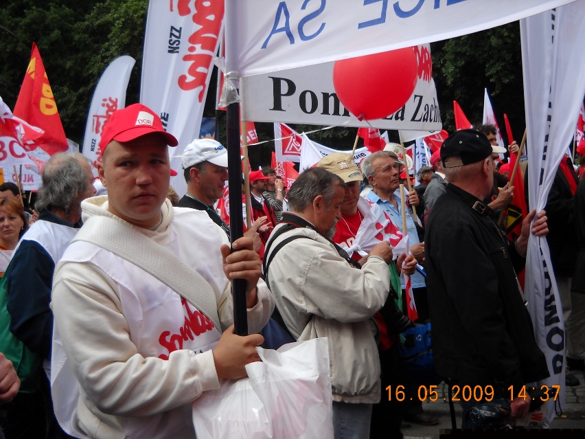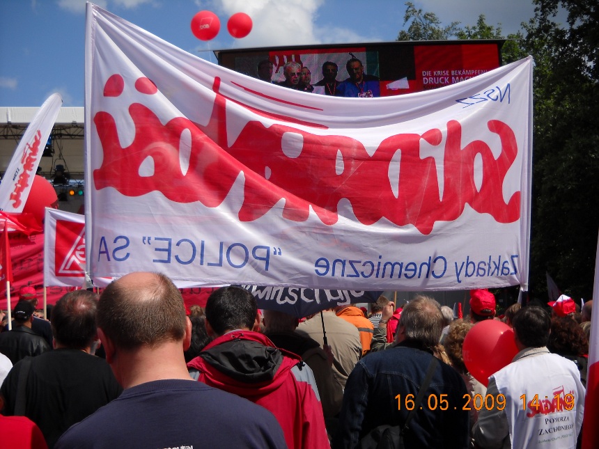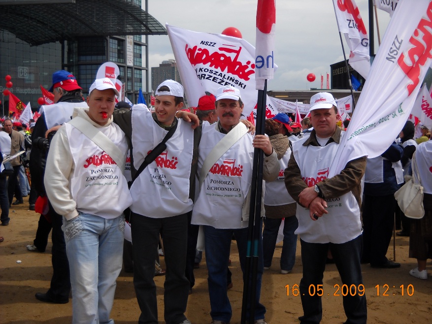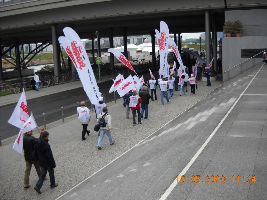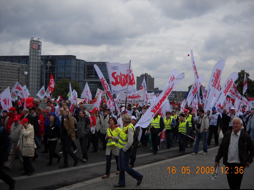 Galeria Galeria 7 - Manifestacja w Berlinie. 16 maj 2009 r. Blisko sto tysięcy osób, w tym 500 związkowców z Polski w tym przedstawiciele z naszej komisji związkowej, wzięło udział w manifestacji w Berlinie, zorganizowanej przez Europejską Konfederację Związków Zawodowych (EKZZ). Dwa pochody pod hasłem "Walczyć z kryzysem. Pakt Socjalny dla Europy. Winni muszą zapłacić" przeszły centralnymi ulicami niemieckiej stolicy pod Kolumnę Zwycięstwa, gdzie odbył się wiec kończący demonstrację.